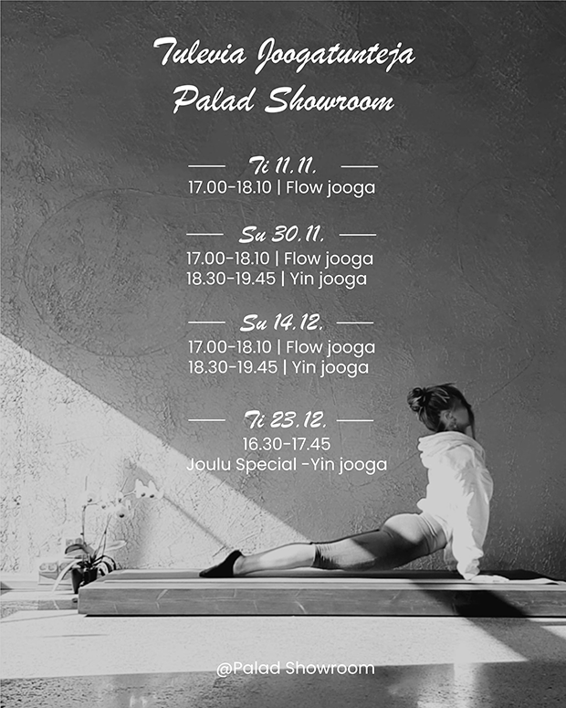 Marraskuu - joulukuu 2025 - SaagaMarian joogatunnit Palad Showroomilla